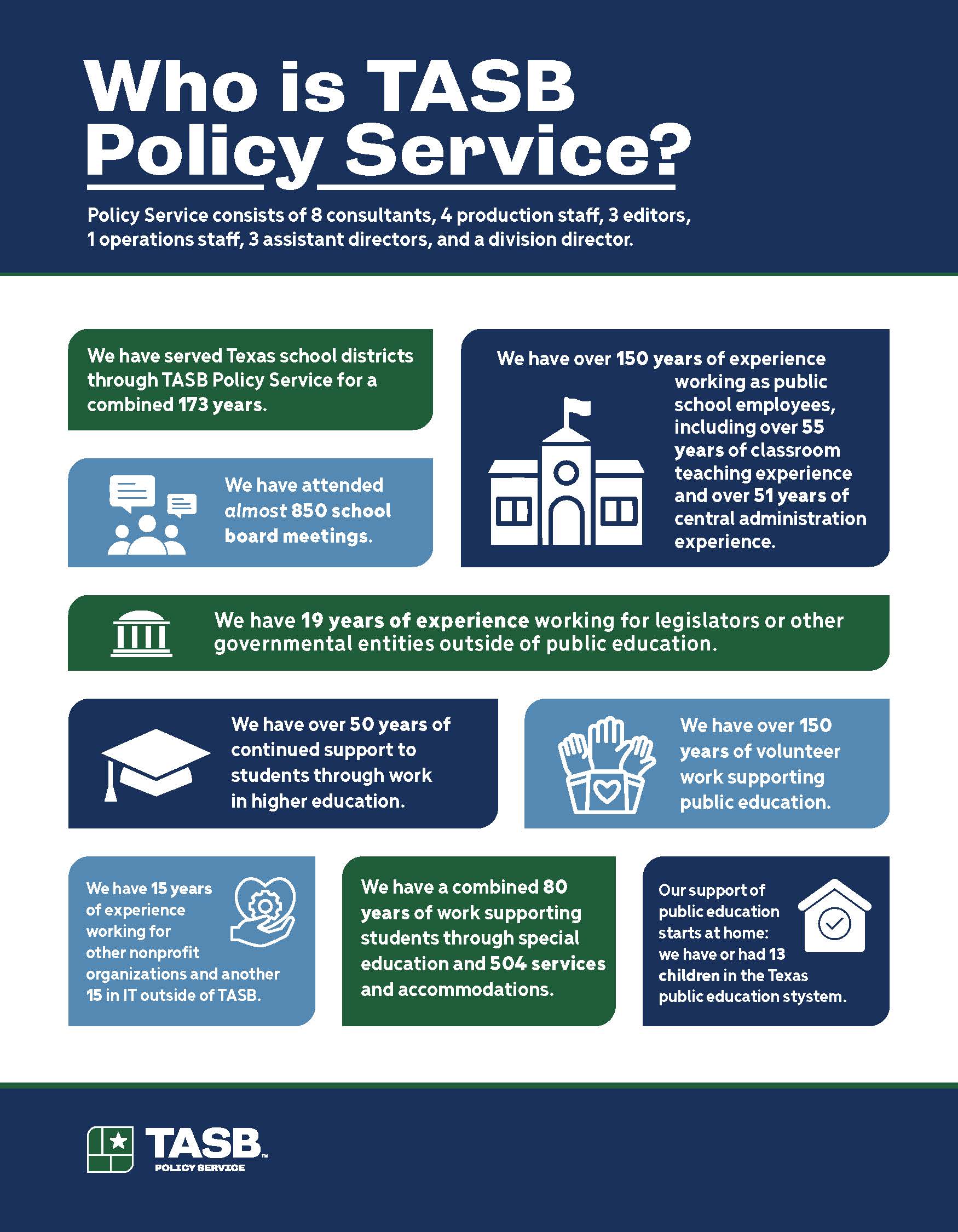 TASB Policy Service is made up of eight policy consultants, three editors, three production staff, two operations staff, three assistant directors (who also serve as policy consultants), and a division director. But who are we really?